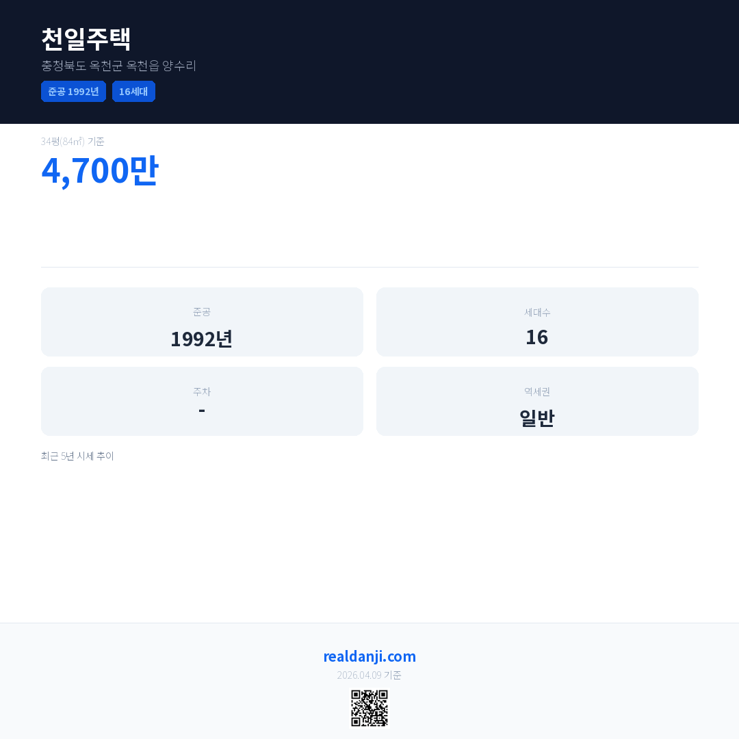 천일주택 국민평형 기준 2018년 평균 거래가는 4,700만으로, 전년 대비 19.0% 하락 했습니다.