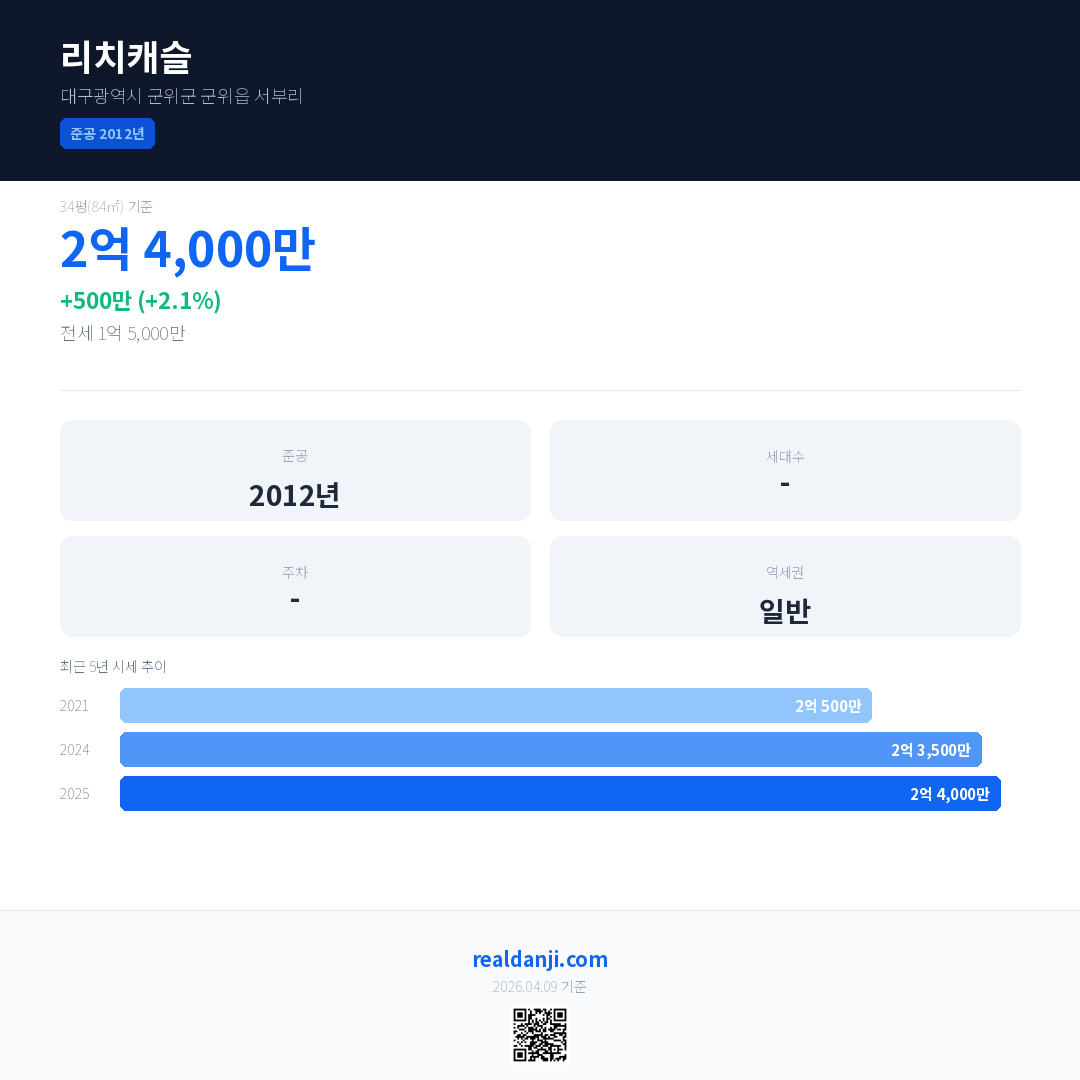 리치캐슬 국민평형 기준 2025년 평균 거래가는 2억 4,000만으로, 전년 대비 2.1% 상승 했습니다.
