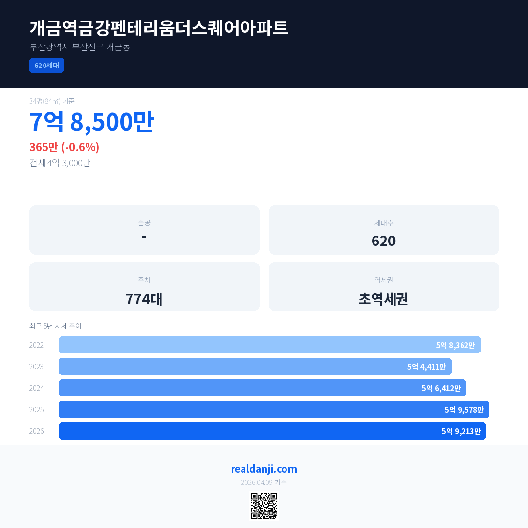 개금역금강펜테리움더스퀘어아파트 최근 거래가는 6억 2,000만입니다. (2026-03)
