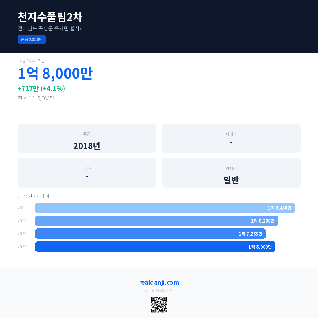 천지수풀림2차 국민평형 기준 2024년 평균 거래가는 1억 8,000만으로, 전년 대비 4.1% 상승 했습니다.