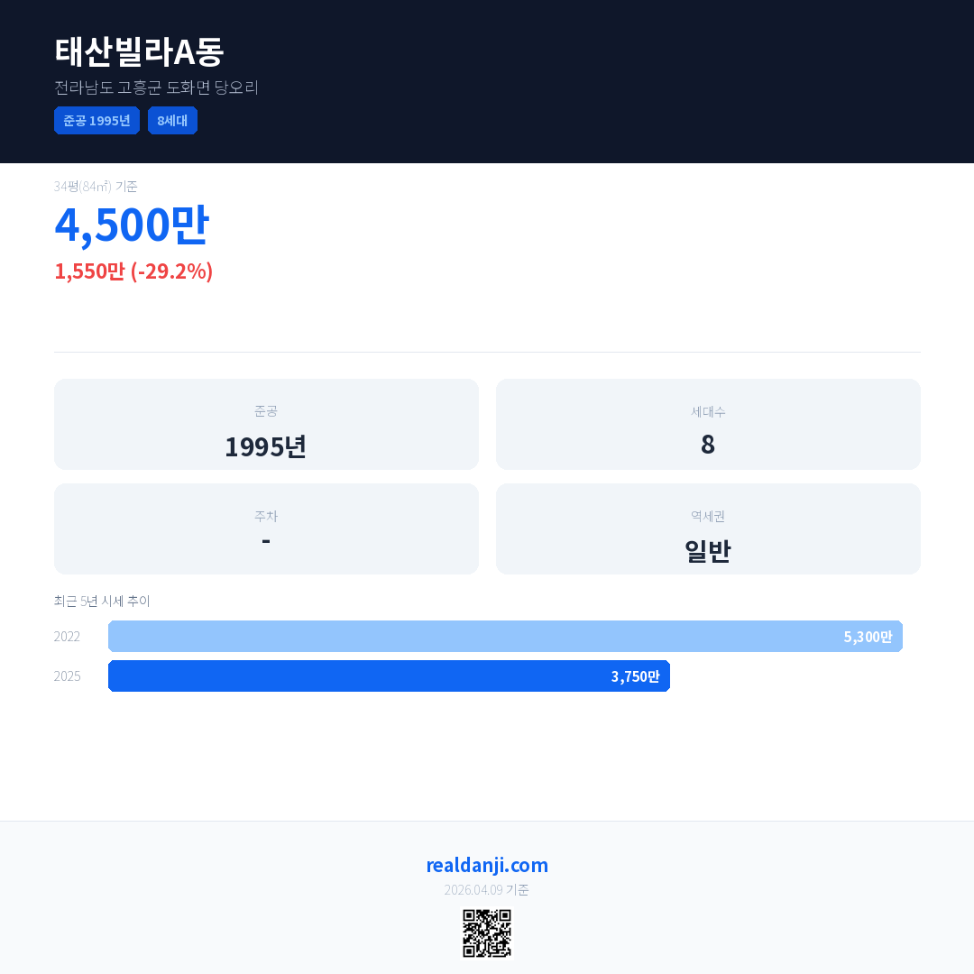 태산빌라A동 최근 거래가는 5,300만입니다. (2025-07)