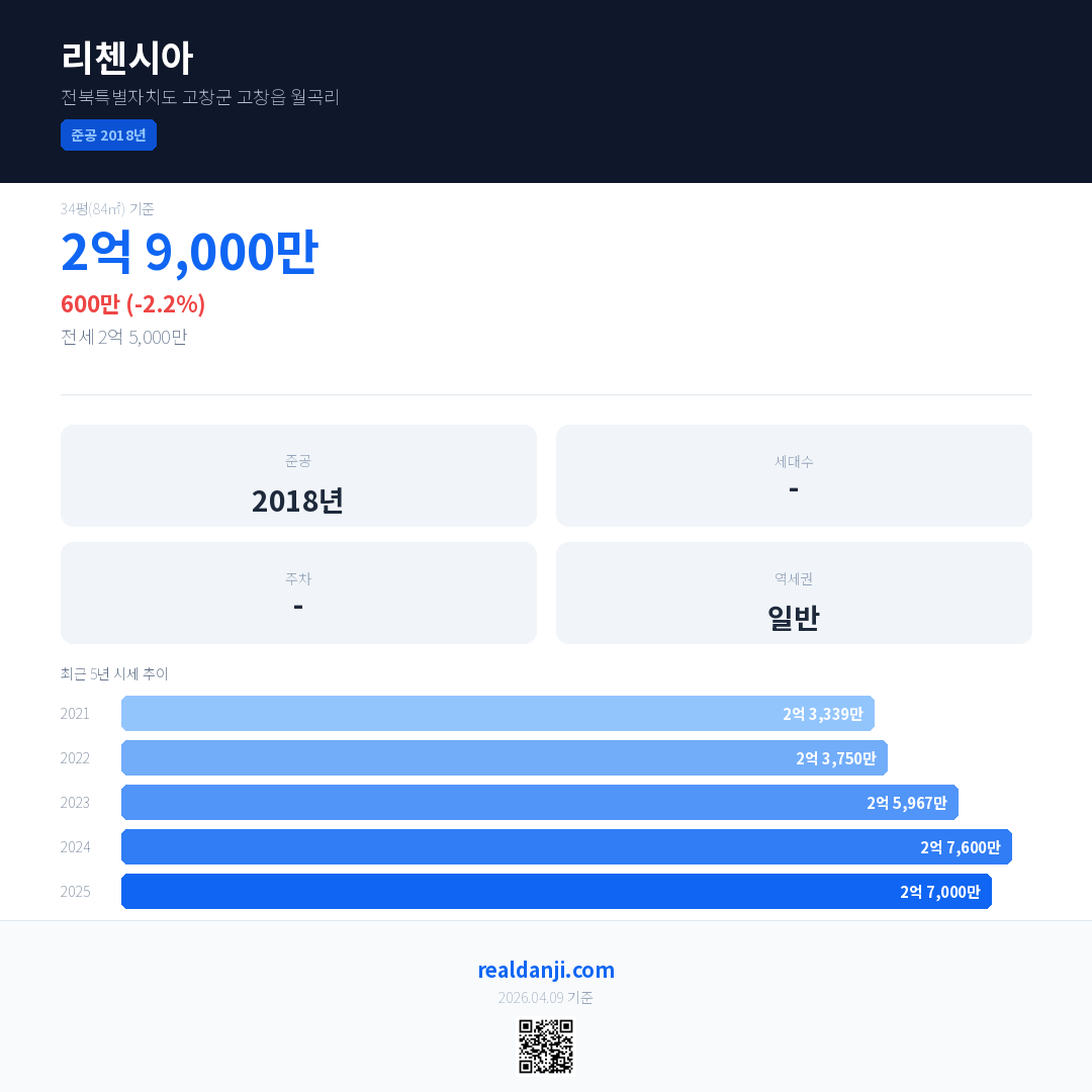 리첸시아 국민평형 기준 2025년 평균 거래가는 2억 7,000만으로, 전년 대비 2.2% 하락 했습니다.
