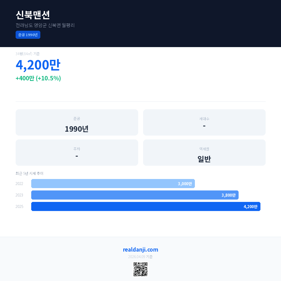 신북맨션 국민평형 기준 2025년 평균 거래가는 4,200만으로, 전년 대비 10.5% 상승 했습니다.