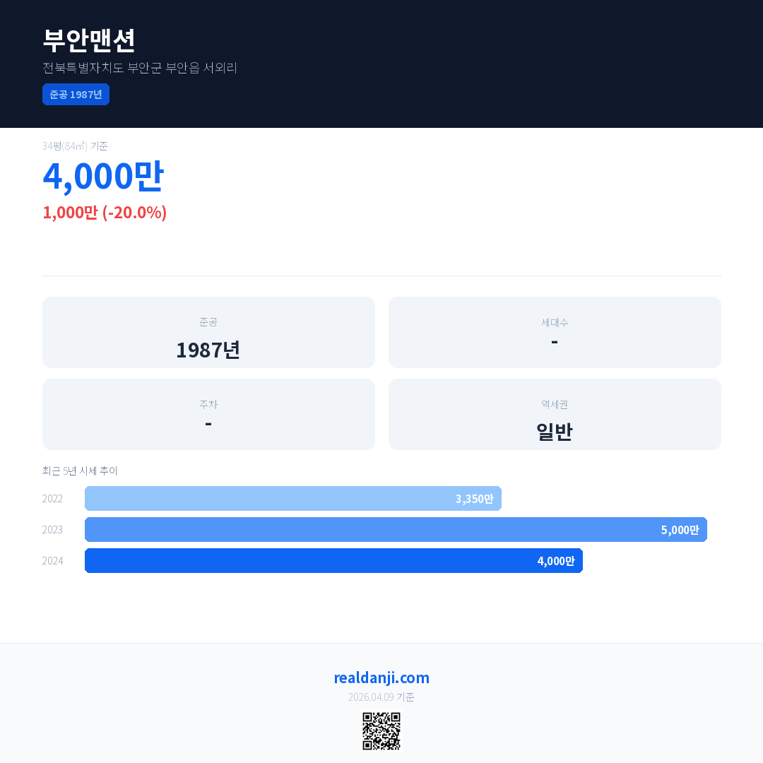 부안맨션 국민평형 기준 2024년 평균 거래가는 4,000만으로, 전년 대비 20.0% 하락 했습니다.