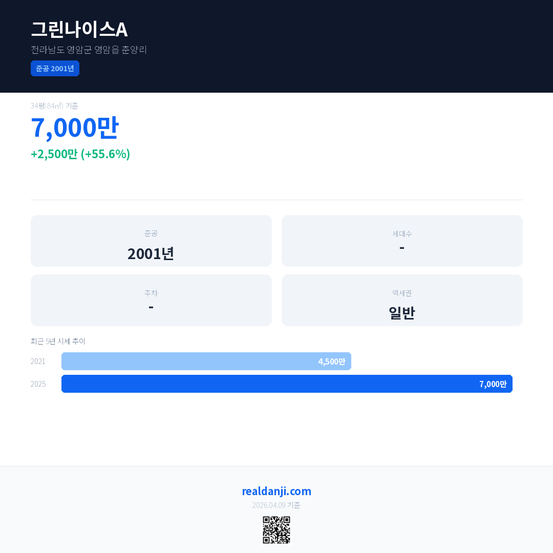 그린나이스A 국민평형 기준 2025년 평균 거래가는 7,000만으로, 전년 대비 55.6% 상승 했습니다.