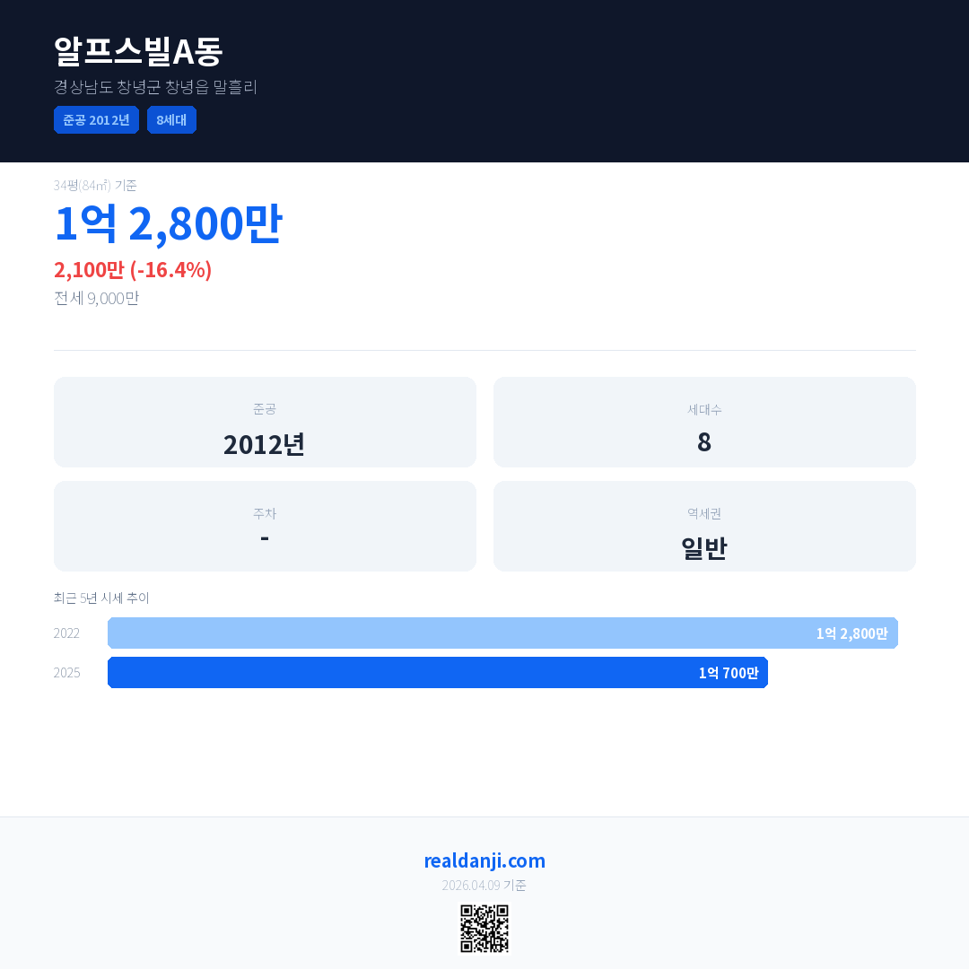 알프스빌A동 국민평형 기준 2025년 평균 거래가는 1억 700만으로, 전년 대비 16.4% 하락 했습니다.