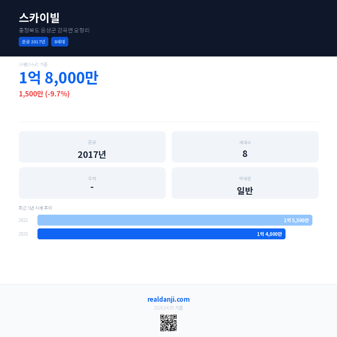 스카이빌 국민평형 기준 2025년 평균 거래가는 1억 4,000만으로, 전년 대비 9.7% 하락 했습니다.