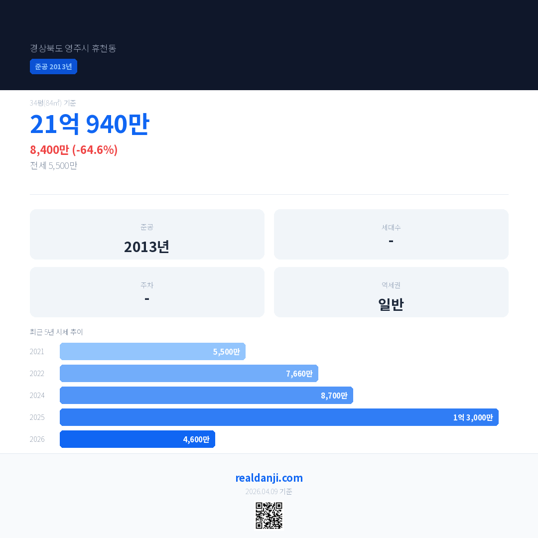 국민평형 기준 2026년 평균 거래가는 4,600만으로, 전년 대비 64.6% 하락 했습니다.