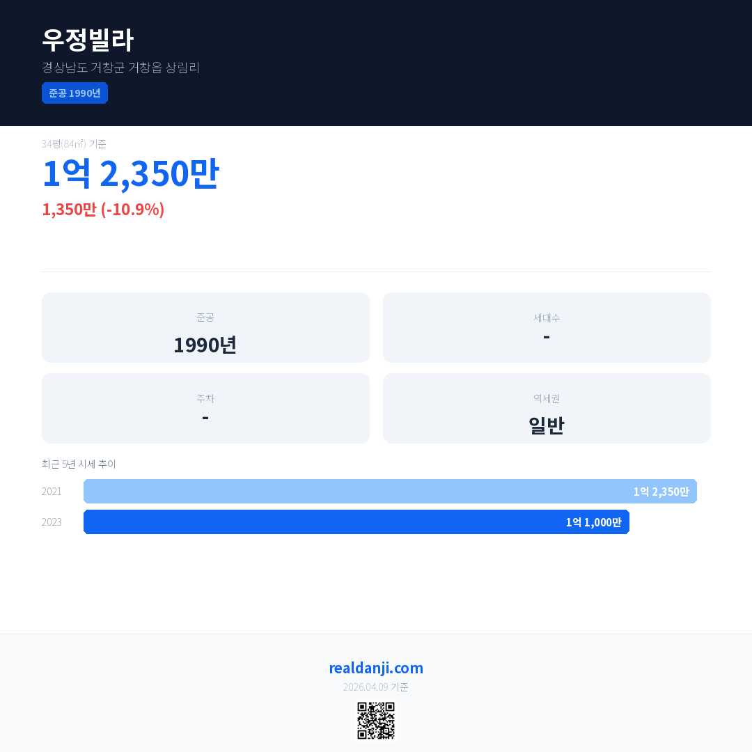 우정빌라 국민평형 기준 2023년 평균 거래가는 1억 1,000만으로, 전년 대비 10.9% 하락 했습니다.