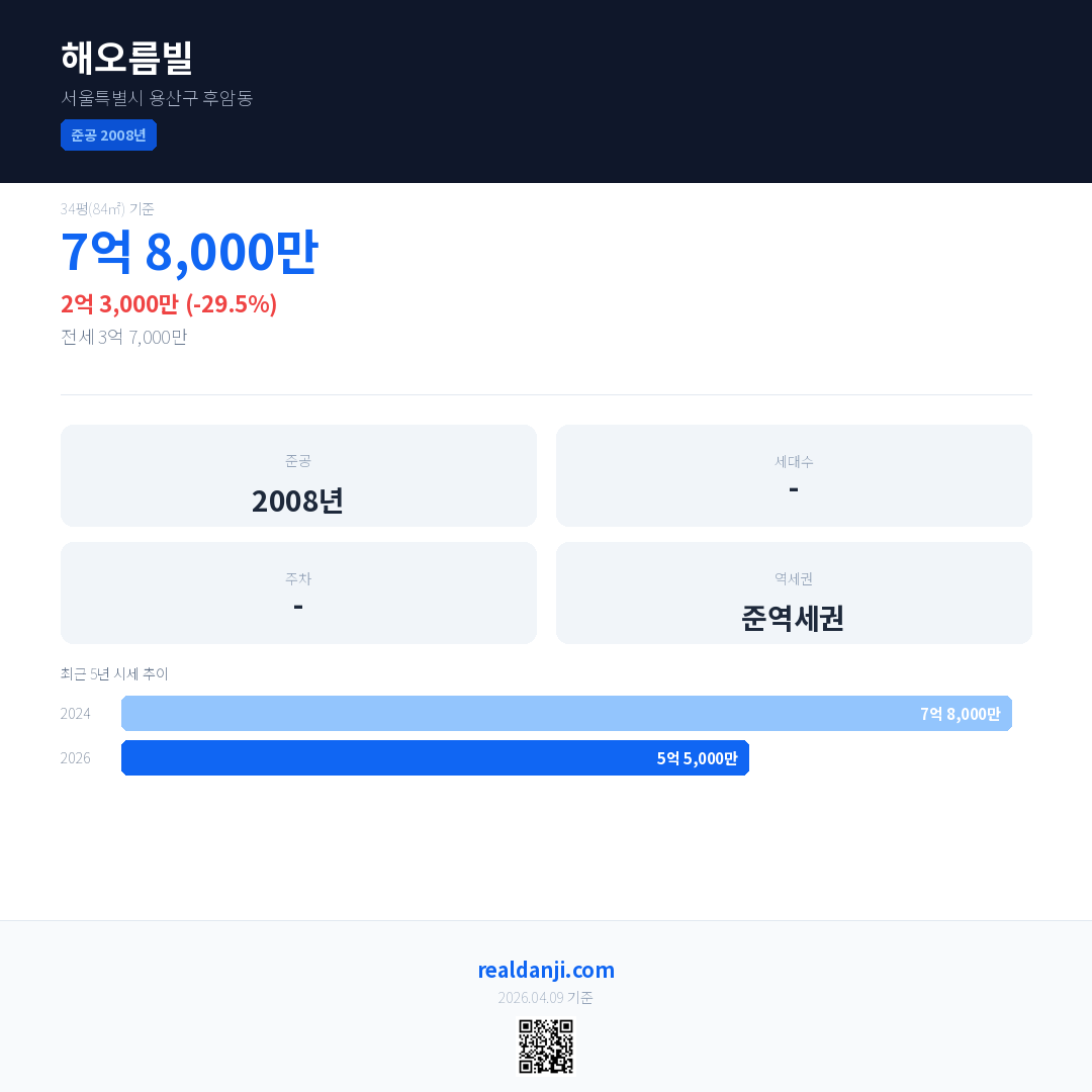 해오름빌 국민평형 기준 2026년 평균 거래가는 5억 5,000만으로, 전년 대비 29.5% 하락 했습니다.