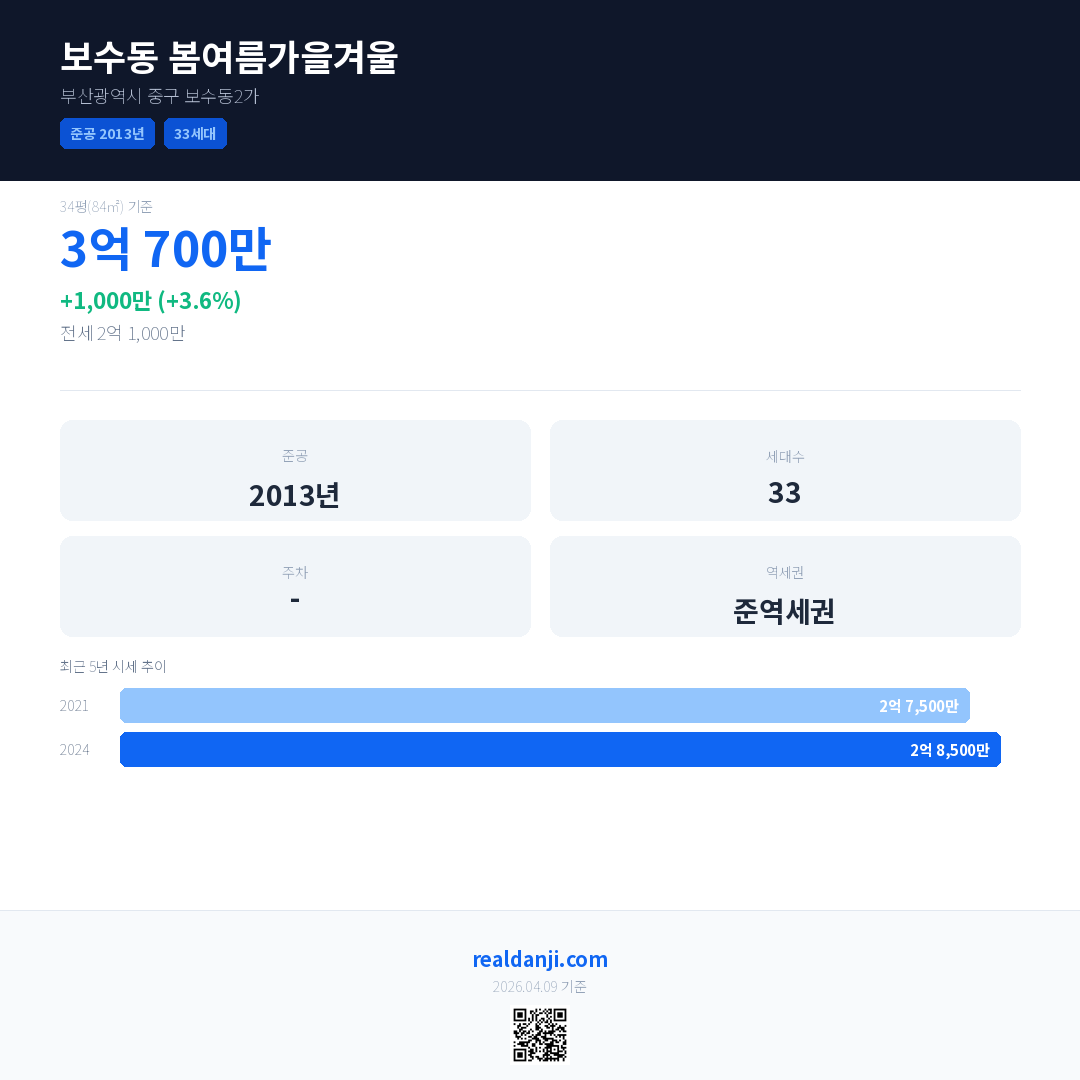보수동 봄여름가을겨울은(는) 2013년에 준공되었으며, 현재 13년차입니다. 총 33세대 규모입니다.
