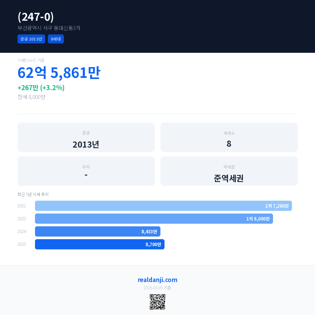 (247-0)은(는) 2013년에 준공되었으며, 현재 13년차입니다. 총 8세대 규모입니다.