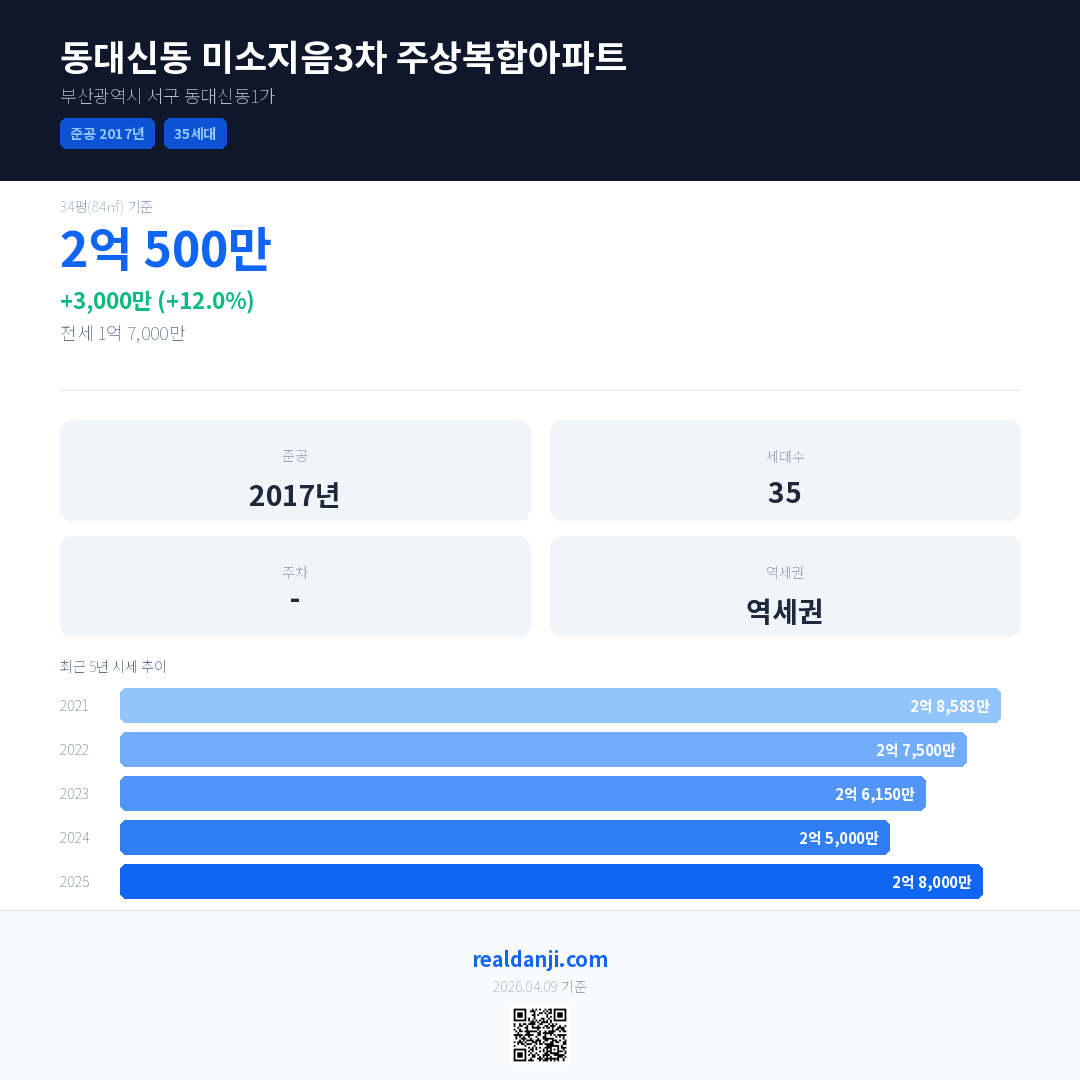 동대신동 미소지음3차 주상복합아파트 국민평형 기준 2025년 평균 거래가는 2억 8,000만으로, 전년 대비 12.0% 상승 했습니다.