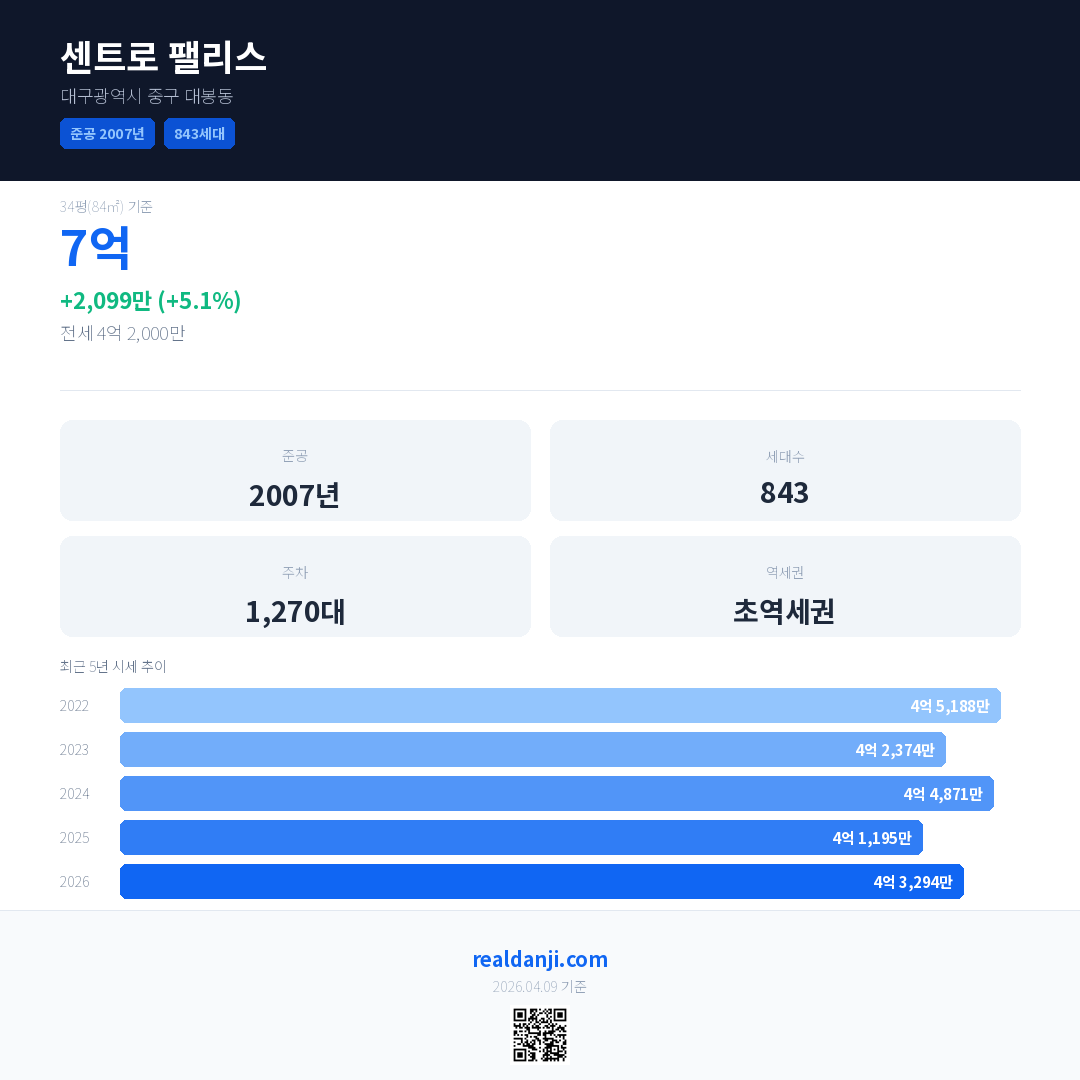 센트로 팰리스 국민평형 기준 2026년 평균 거래가는 4억 3,294만으로, 전년 대비 5.1% 상승 했습니다.