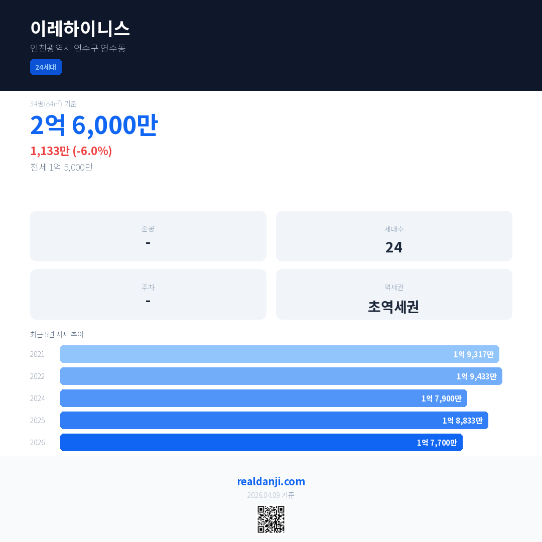 이레하이니스 국민평형 기준 2026년 평균 거래가는 1억 7,700만으로, 전년 대비 6.0% 하락 했습니다.