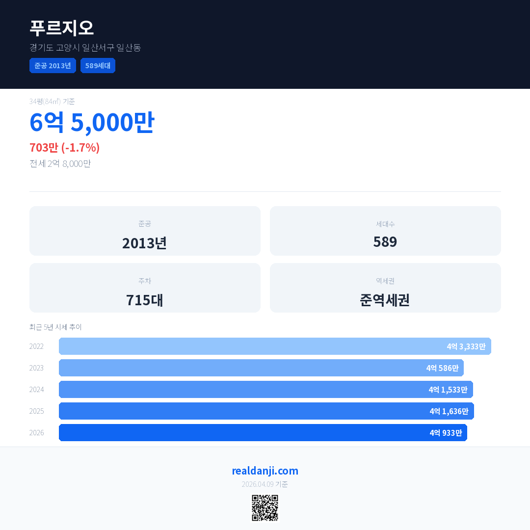 푸르지오은(는) 2013년에 준공되었으며, 현재 13년차입니다. 총 589세대 규모입니다.