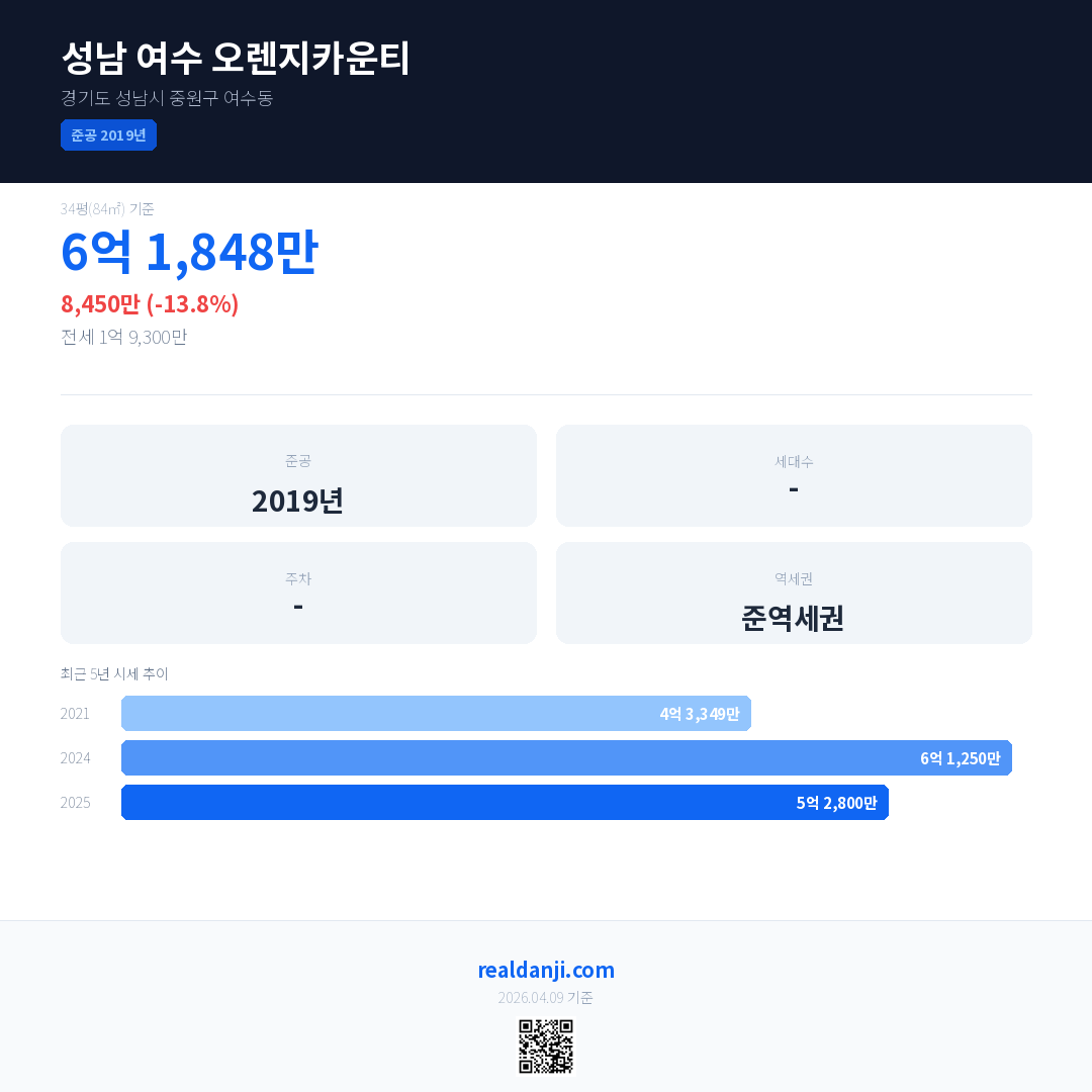 성남 여수 오렌지카운티 최근 거래가는 6억 1,848만입니다. (2026-02)