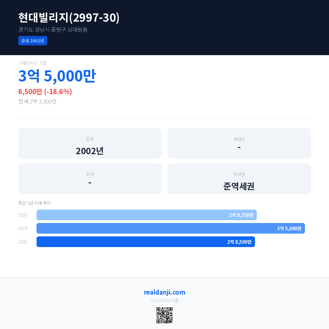 현대빌리지(2997-30) 국민평형 기준 2026년 평균 거래가는 2억 8,500만으로, 전년 대비 18.6% 하락 했습니다.