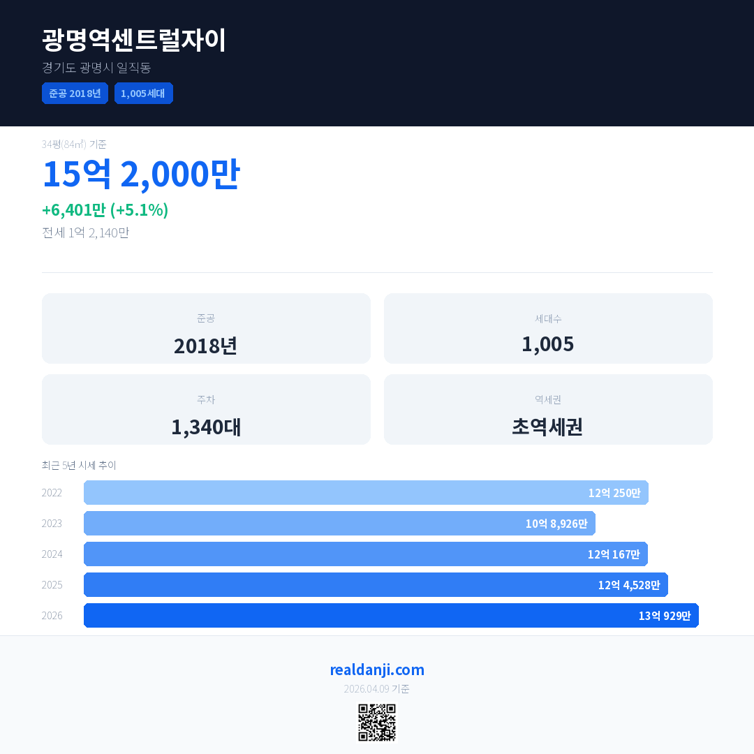 광명역센트럴자이 국민평형 기준 2026년 평균 거래가는 13억 929만으로, 전년 대비 5.1% 상승 했습니다.