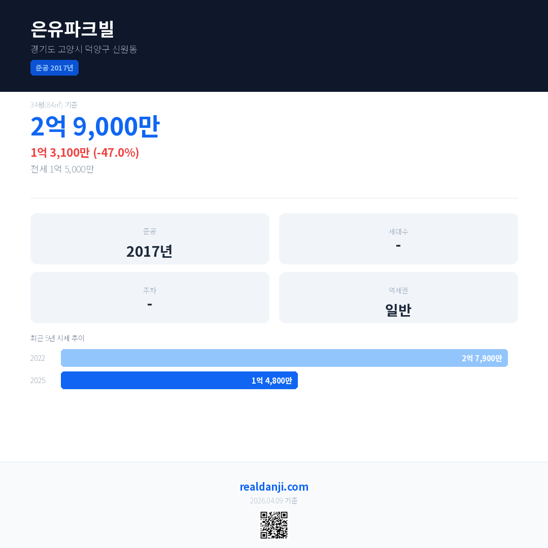 은유파크빌 국민평형 기준 2025년 평균 거래가는 1억 4,800만으로, 전년 대비 47.0% 하락 했습니다.