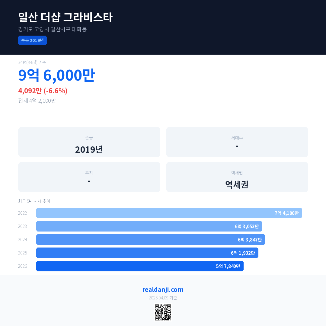 일산 더샵 그라비스타 국민평형 기준 2026년 평균 거래가는 5억 7,840만으로, 전년 대비 6.6% 하락 했습니다.