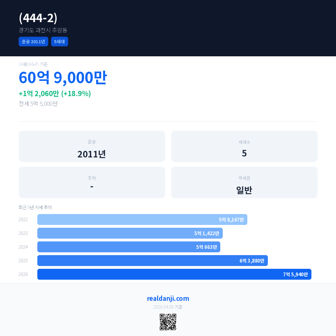(444-2)은(는) 2011년에 준공되었으며, 현재 15년차입니다. 총 5세대 규모입니다.