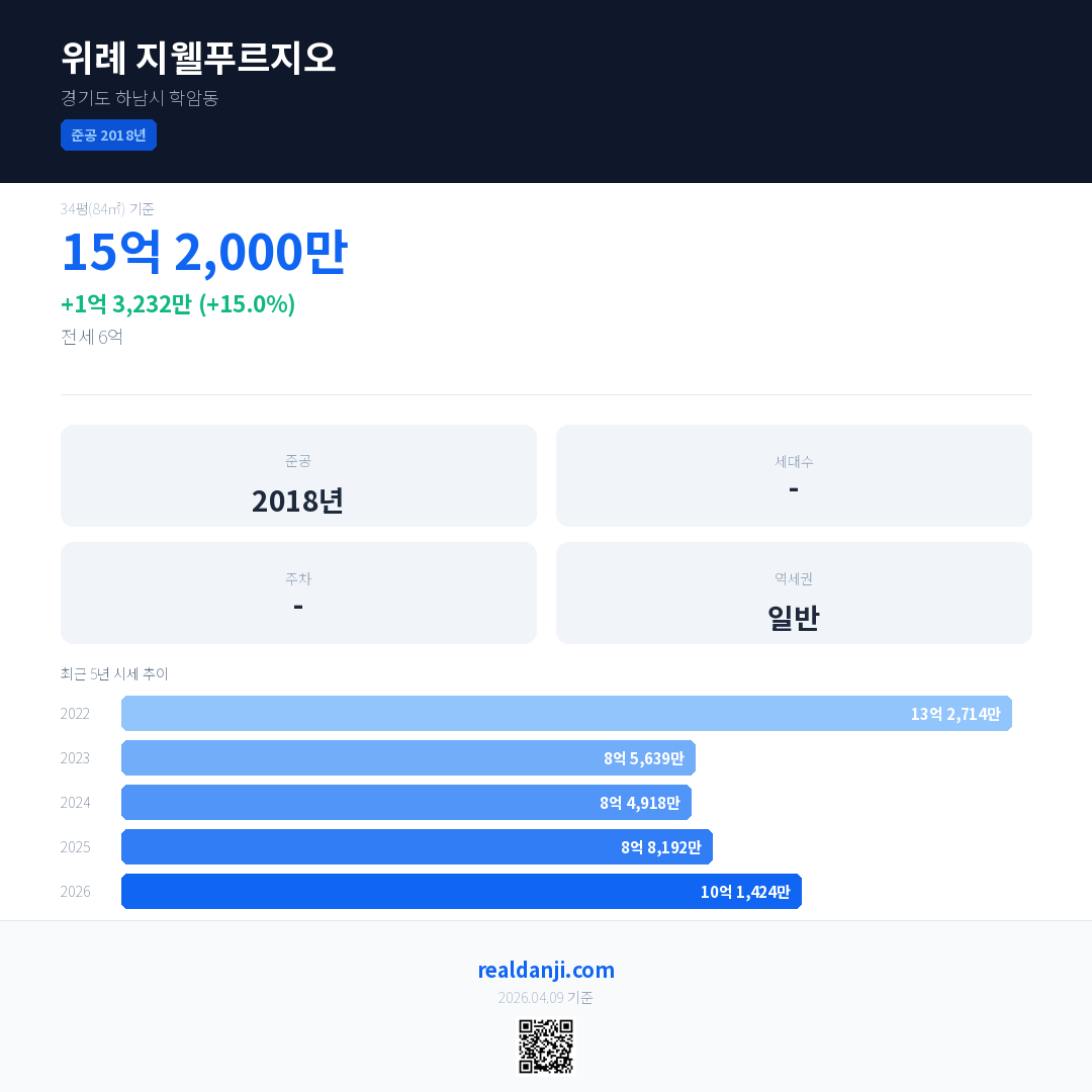 위례 지웰푸르지오 국민평형 기준 2026년 평균 거래가는 10억 1,424만으로, 전년 대비 15.0% 상승 했습니다.