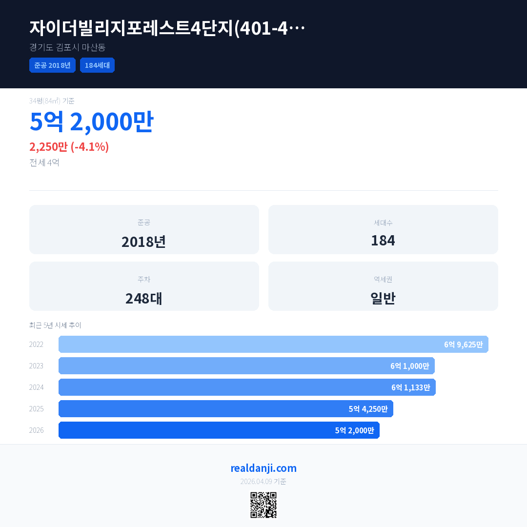 자이더빌리지포레스트4단지(401-415동) 국민평형 기준 2026년 평균 거래가는 5억 2,000만으로, 전년 대비 4.1% 하락 했습니다.