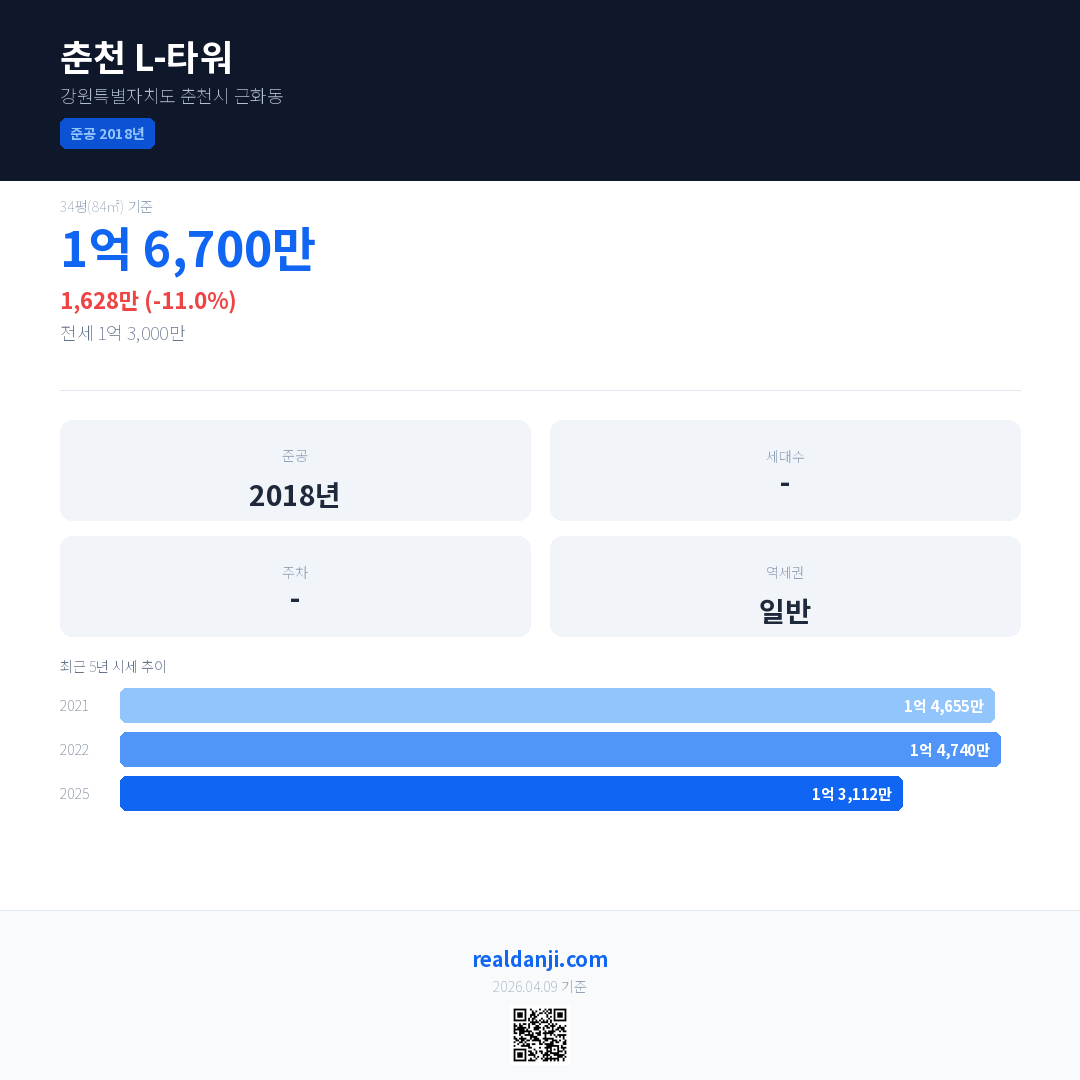 춘천 L-타워 최근 거래가는 1억 6,700만입니다. (2026-03)