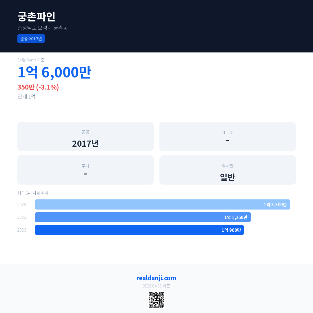 궁촌파인 최근 거래가는 1억 6,000만입니다. (2026-03)