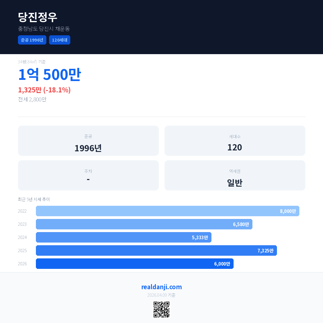 당진정우은(는) 1996년에 준공되었으며, 현재 30년차입니다. 총 120세대 규모입니다.