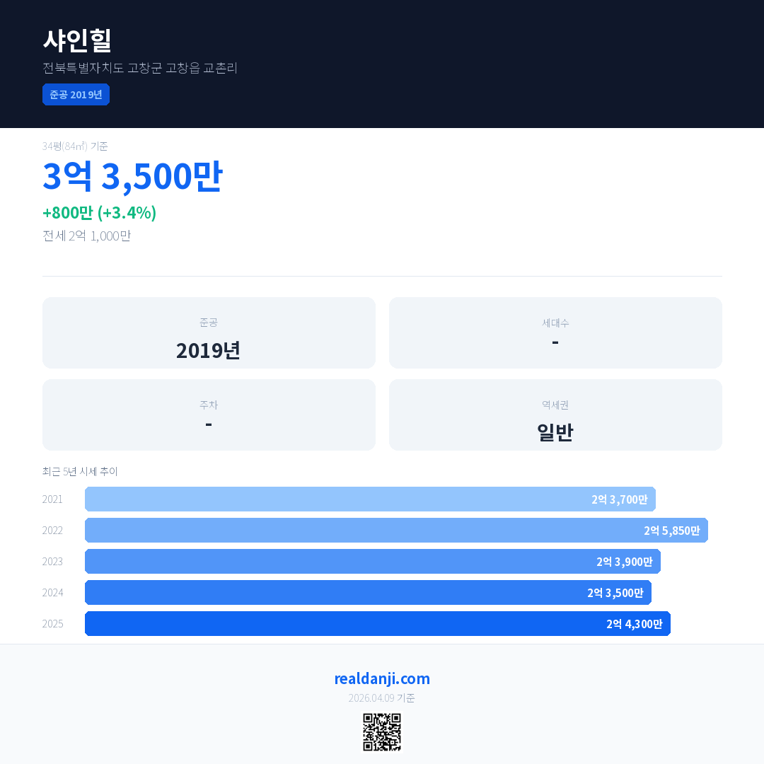 샤인힐 국민평형 기준 2025년 평균 거래가는 2억 4,300만으로, 전년 대비 3.4% 상승 했습니다.