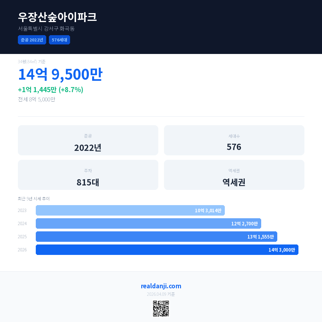 우장산숲아이파크 국민평형 기준 2026년 평균 거래가는 14억 3,000만으로, 전년 대비 8.7% 상승 했습니다.