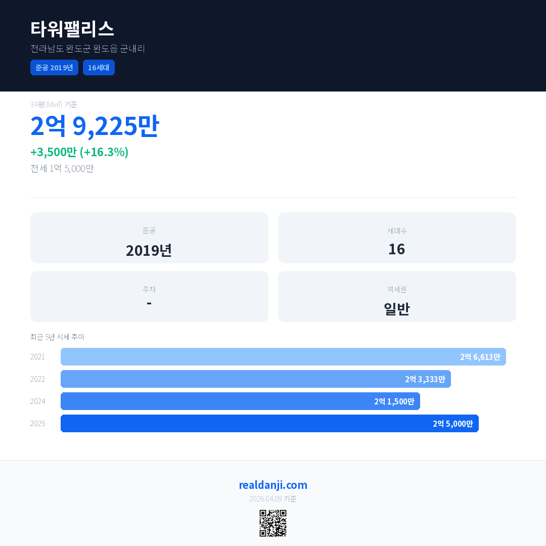 타워팰리스은(는) 2019년에 준공되었으며, 현재 7년차입니다. 총 16세대 규모입니다.