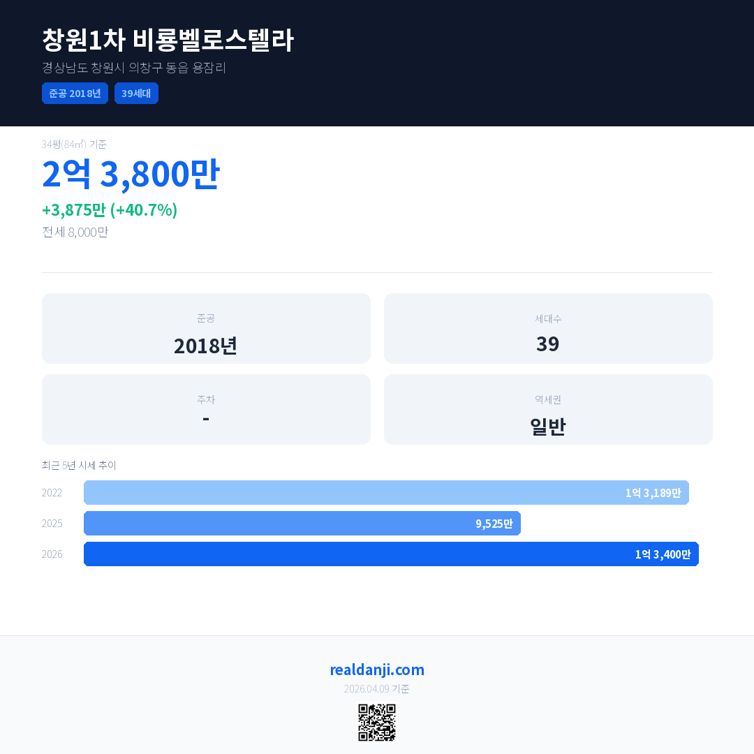 창원1차 비룡벨로스텔라 국민평형 기준 2026년 평균 거래가는 1억 3,400만으로, 전년 대비 40.7% 상승 했습니다.