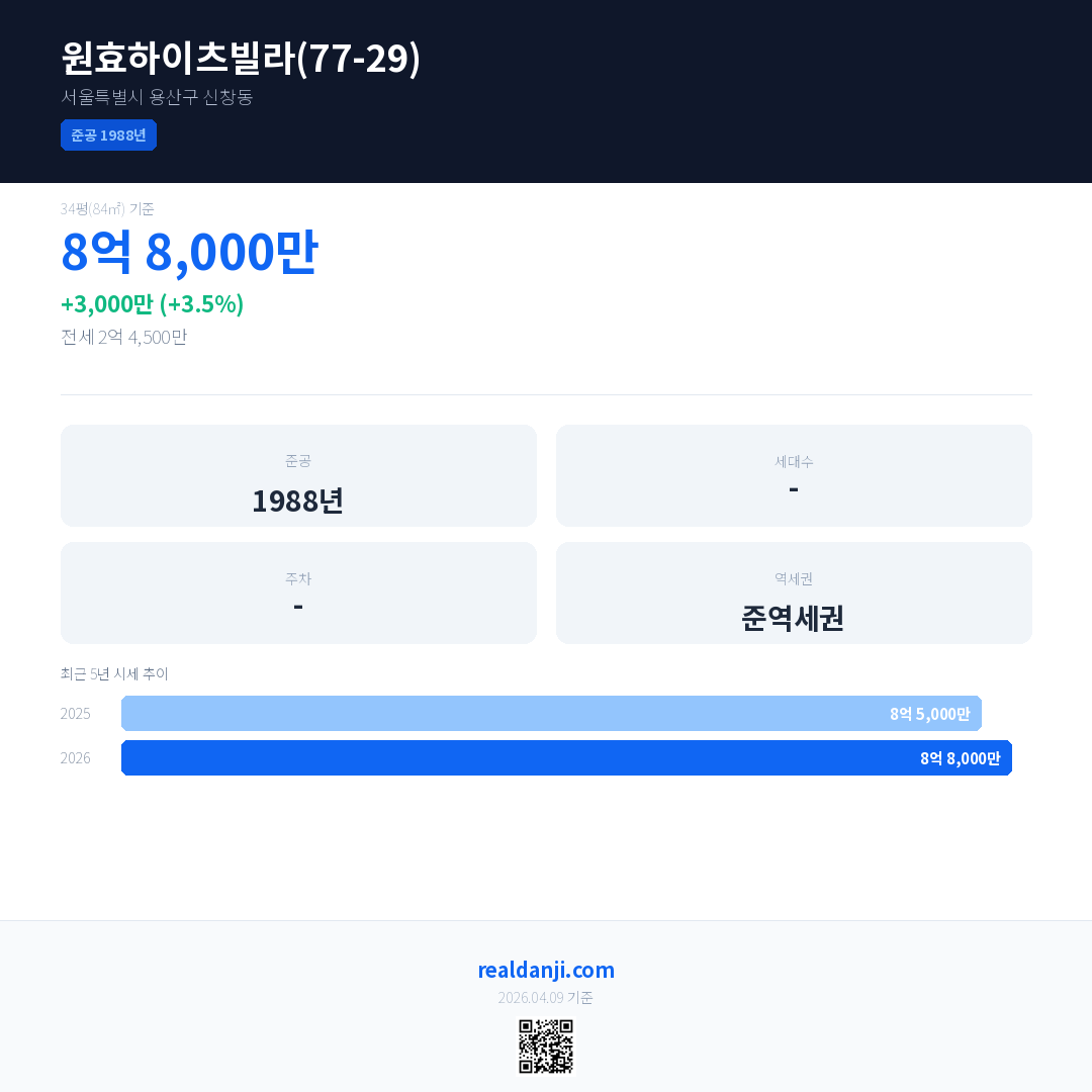 원효하이츠빌라(77-29) 최근 거래가는 8억 8,000만입니다. (2026-03)