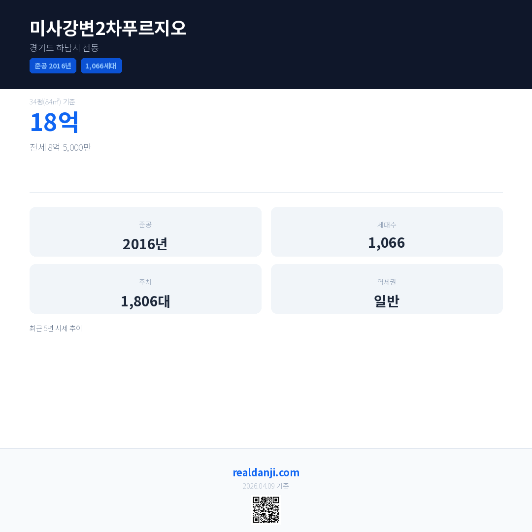 미사강변2차푸르지오 최근 거래가는 18억입니다. (2026-03)