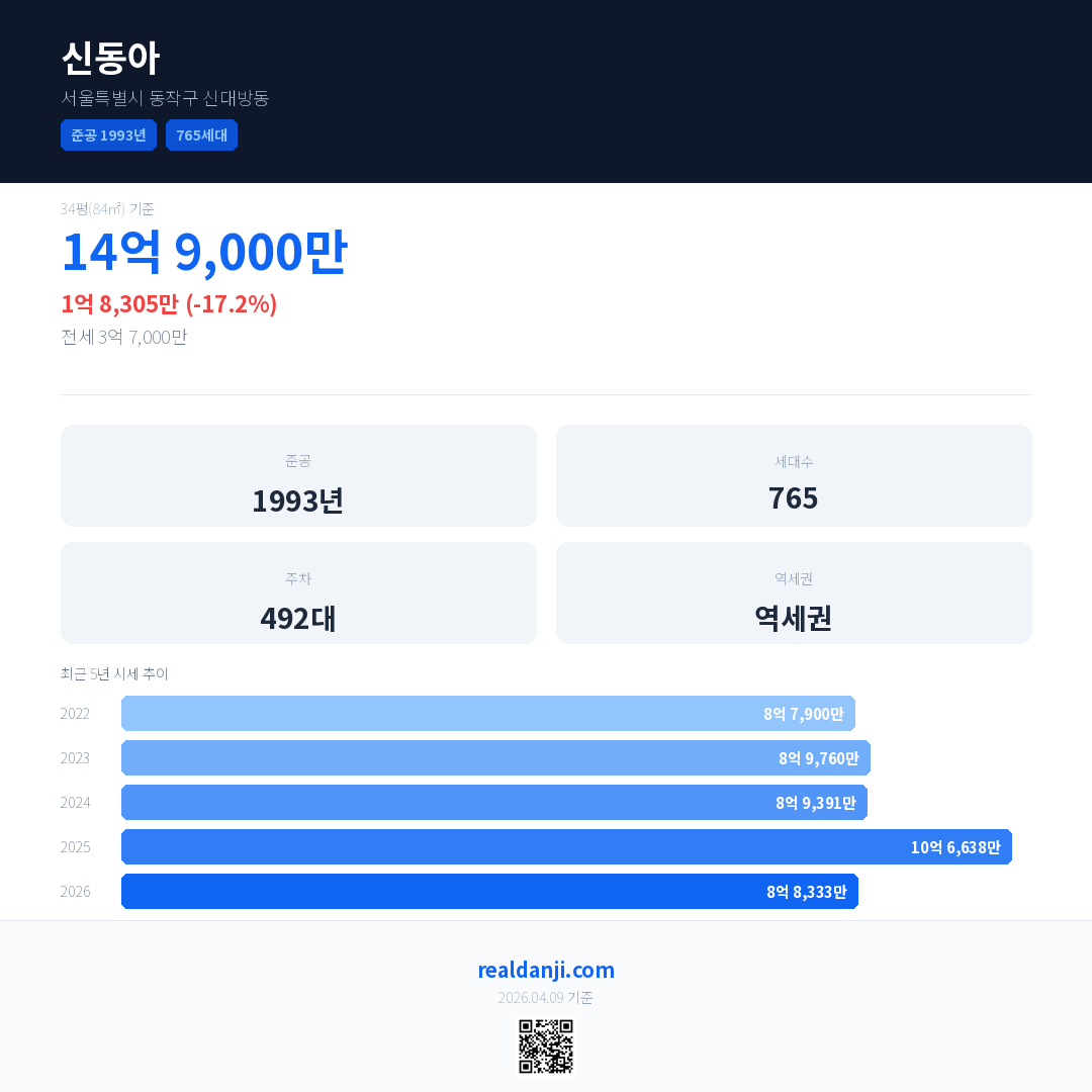 신동아 국민평형 기준 2026년 평균 거래가는 8억 8,333만으로, 전년 대비 17.2% 하락 했습니다.