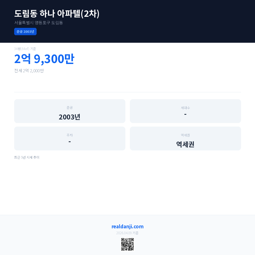 도림동 하나 아파텔(2차)은(는) 2003년에 준공되었으며, 현재 23년차입니다.