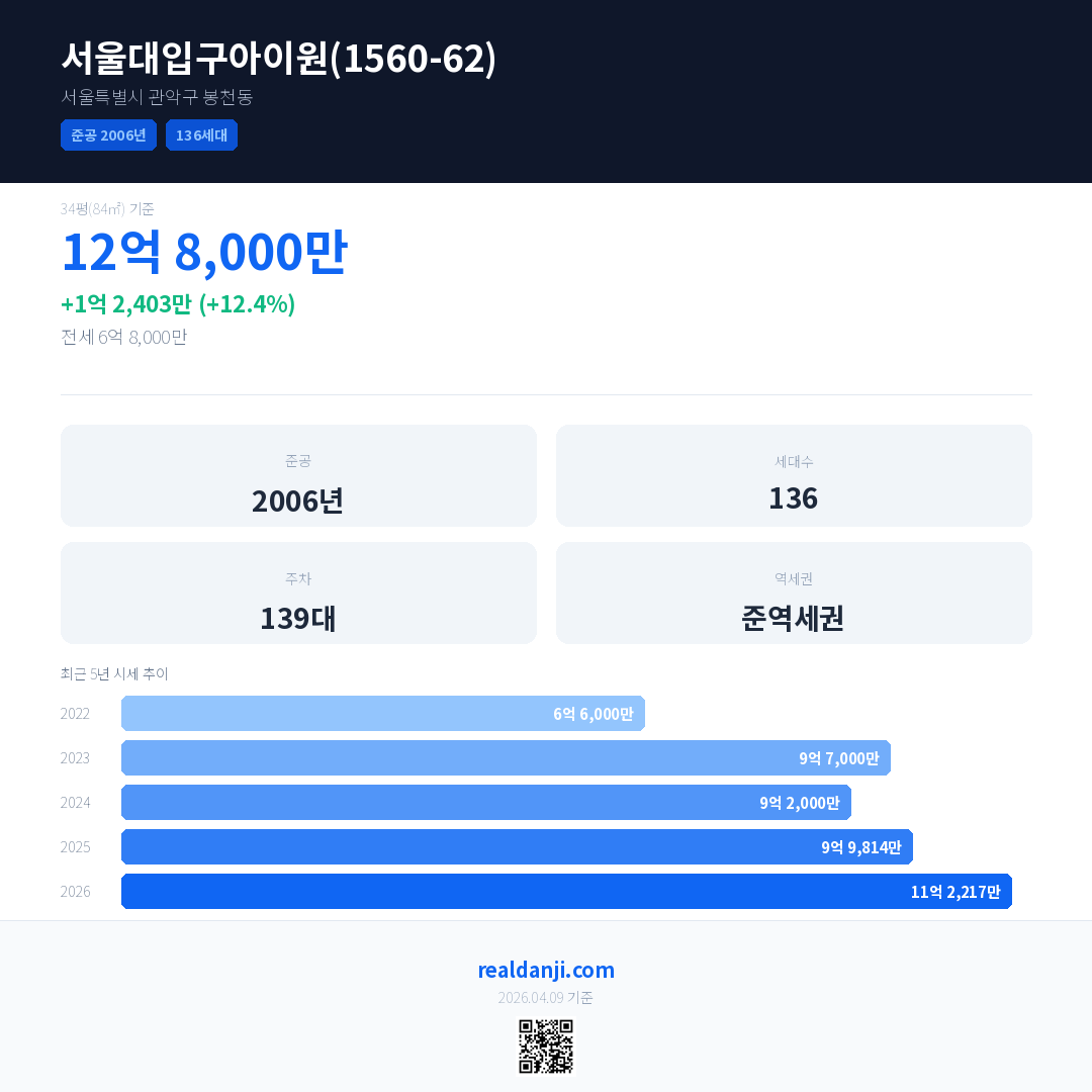 서울대입구아이원(1560-62) 국민평형 기준 2026년 평균 거래가는 11억 2,217만으로, 전년 대비 12.4% 상승 했습니다.