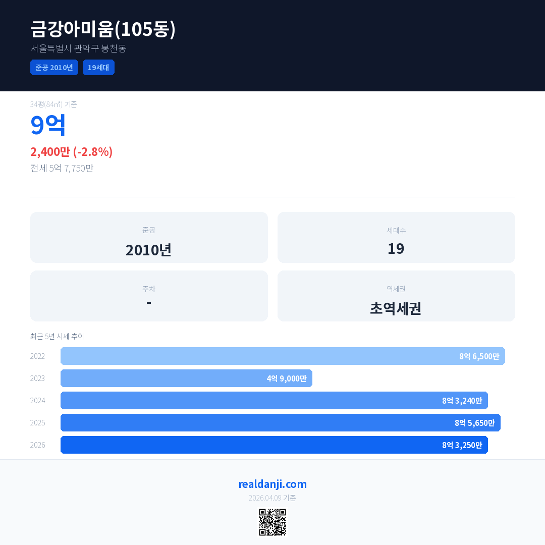 금강아미움(105동) 최근 거래가는 9억입니다. (2026-04)