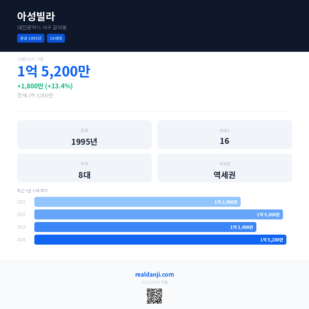 아성빌라 국민평형 기준 2026년 평균 거래가는 1억 5,200만으로, 전년 대비 13.4% 상승 했습니다.