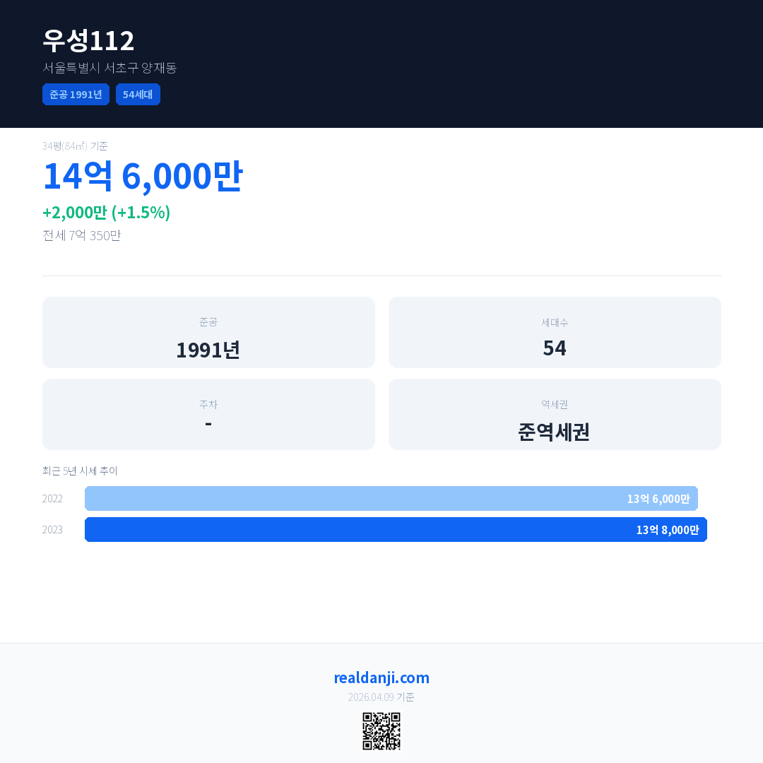 우성112 국민평형 기준 2023년 평균 거래가는 13억 8,000만으로, 전년 대비 1.5% 상승 했습니다.