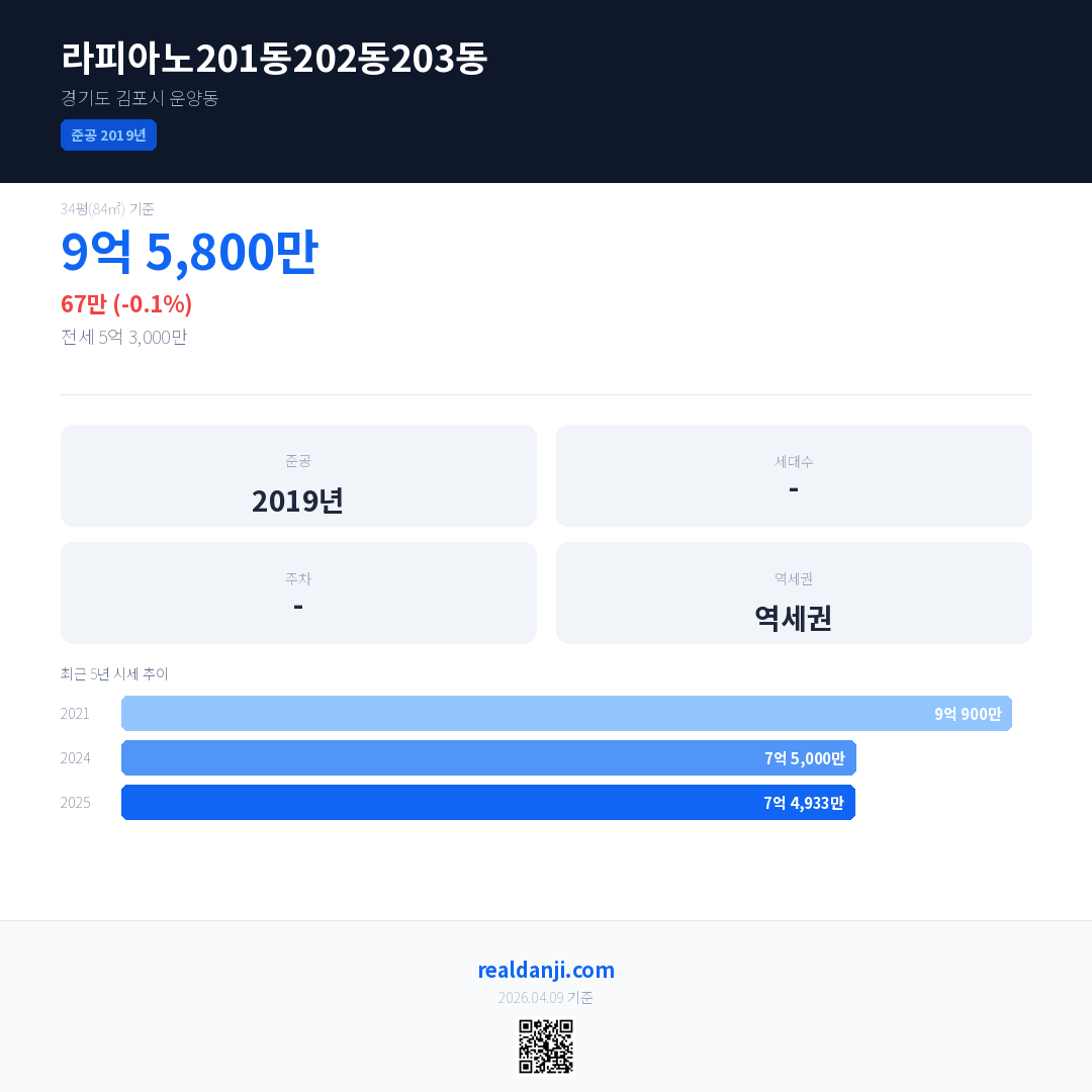 라피아노201동202동203동 최근 거래가는 9억 5,800만입니다. (2025-07)