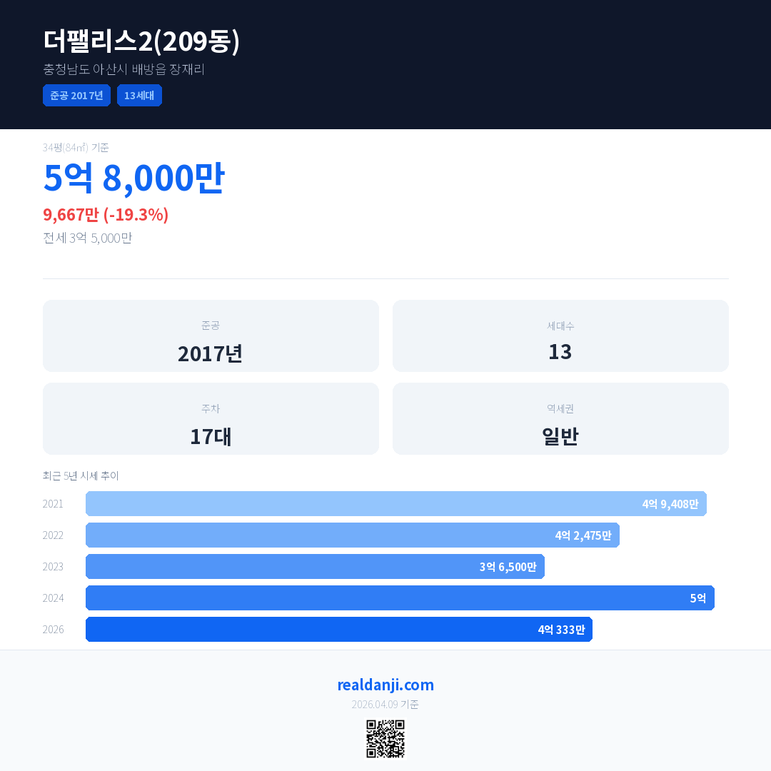 더팰리스2(209동)은(는) 2017년에 준공되었으며, 현재 9년차입니다. 총 13세대 규모입니다.