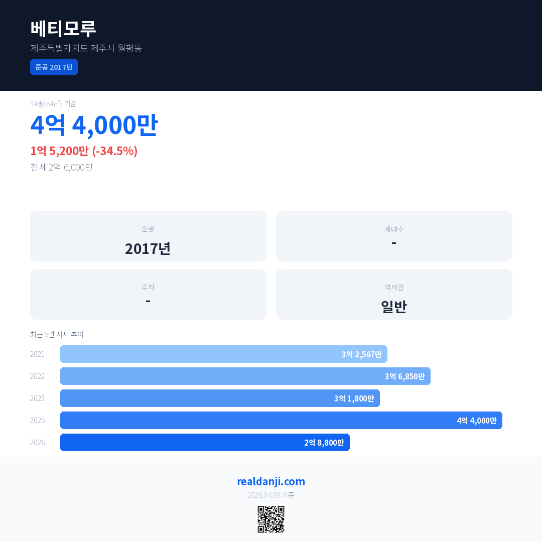 베티모루 국민평형 기준 2026년 평균 거래가는 2억 8,800만으로, 전년 대비 34.5% 하락 했습니다.