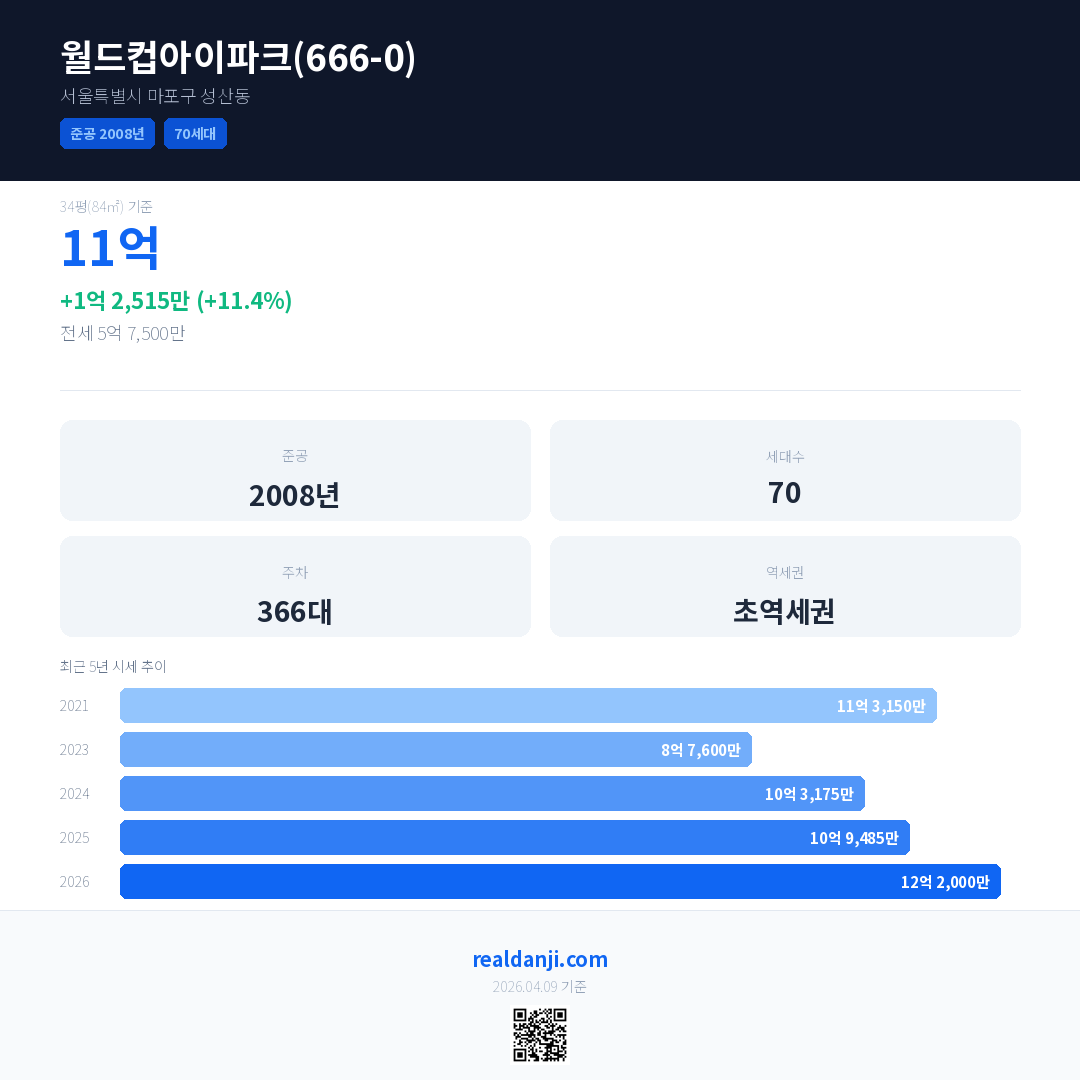 월드컵아이파크(666-0) 최근 거래가는 13억입니다. (2026-01)