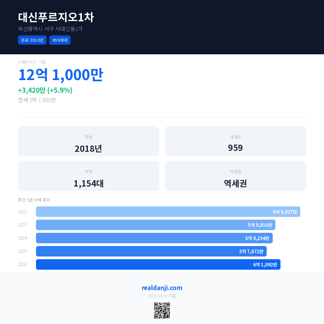 대신푸르지오1차 국민평형 기준 2026년 평균 거래가는 6억 1,092만으로, 전년 대비 5.9% 상승 했습니다.