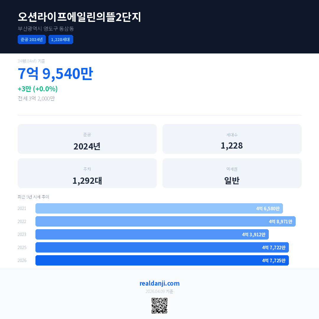 오션라이프에일린의뜰2단지 국민평형 기준 2026년 평균 거래가는 4억 7,725만으로, 전년 대비 0.0% 하락 했습니다.