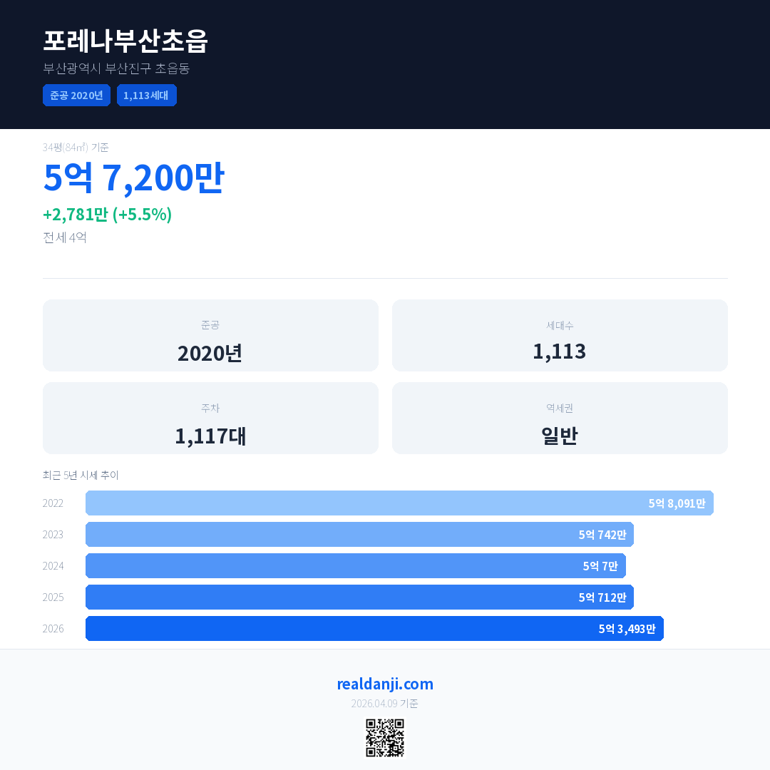포레나부산초읍 국민평형 기준 2026년 평균 거래가는 5억 3,493만으로, 전년 대비 5.5% 상승 했습니다.